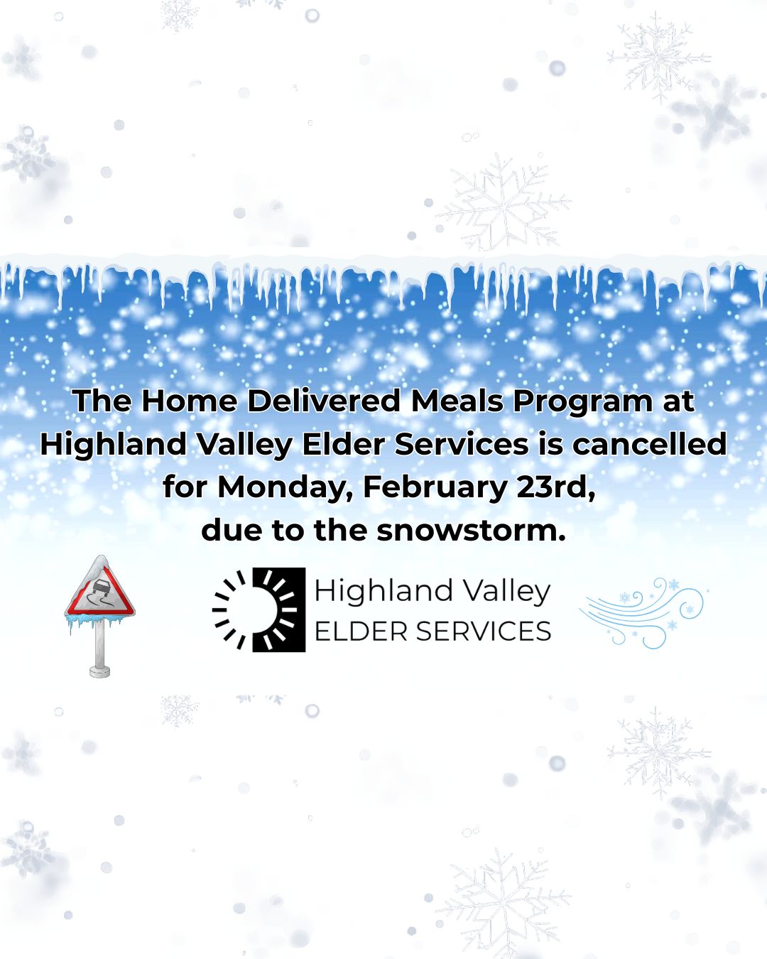 Due to the snowstorm, Highland Valley Elder Services will not be delivering a meal on Monday, February 23rd. We apologize… Read More →